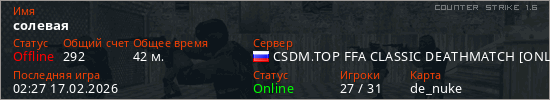 Играет на Counter Strike 1.6 сервере. Страна: РоссияПервый раз замечен 00:57 10.02.2026