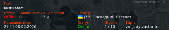 Играет на Counter Strike 1.6 сервере. Страна: УкраинаПервый раз замечен 21:52 05.02.2026