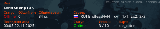 Играет на Counter Strike Global Offensive сервере. Страна: РоссияПервый раз замечен 14:08 16.11.2025