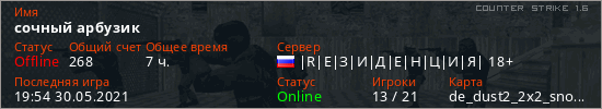 Последний раз был в сети 19:54 30.05.2021 Игрок с таким ником замечен на 2 серверах