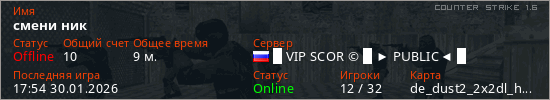 Играет на Counter Strike 1.6 сервере. Страна: РоссияПервый раз замечен 17:37 30.01.2026