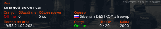 Играет на Counter Strike Source сервере. Страна: РоссияПервый раз замечен 19:49 21.02.2024