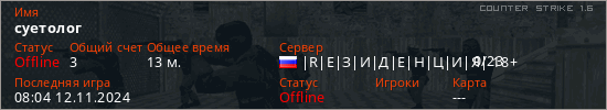 Играет на Counter Strike 1.6 сервере. Страна: РоссияПервый раз замечен 08:10 16.05.2024
