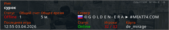 Играет на Counter Strike 1.6 сервере. Страна: РоссияПервый раз замечен 12:53 03.04.2026