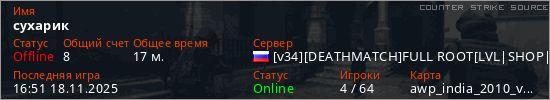 Играет на Counter Strike Source сервере. Страна: РоссияПервый раз замечен 19:32 27.11.2023