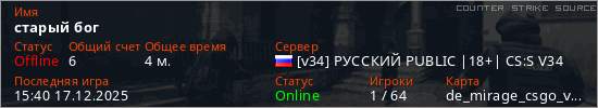 Играет на Counter Strike Source сервере. Страна: РоссияПервый раз замечен 15:27 17.12.2025