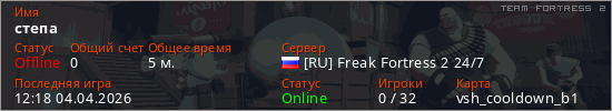 Играет на Team Fortress 2 сервере. Страна: РоссияПервый раз замечен 12:09 04.04.2026