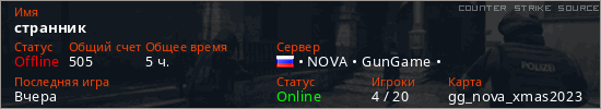 Играет на Counter Strike Source сервере. Страна: РоссияПервый раз замечен 22:10 28.02.2023