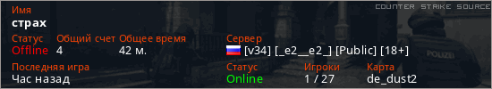 Играет на Counter Strike Source сервере. Страна: РоссияПервый раз замечен 16:22 17.01.2026