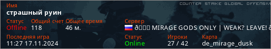 Играет на Counter Strike Global Offensive сервере. Страна: РоссияПервый раз замечен 18:54 07.11.2024