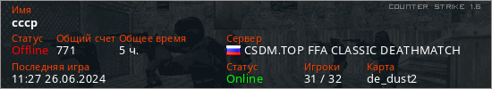 Играет на Counter Strike 1.6 сервере. Страна: РоссияПервый раз замечен 19:24 10.11.2019