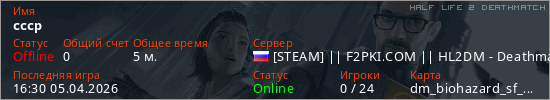 Играет на Half Life 2 DeathMatch сервере. Страна: РоссияПервый раз замечен 16:20 05.04.2026