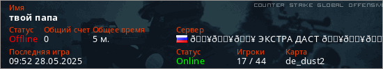 Играет на Counter Strike Global Offensive сервере. Страна: РоссияПервый раз замечен 09:48 28.05.2025