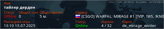 Играет на Counter Strike Global Offensive сервере. Страна: РоссияПервый раз замечен 13:03 15.07.2025