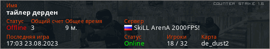 Играет на Counter Strike 1.6 сервере. Страна: РоссияПервый раз замечен 17:03 09.07.2023