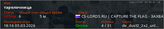 Играет на Counter Strike 1.6 сервере. Страна: РоссияПервый раз замечен 17:20 05.03.2026