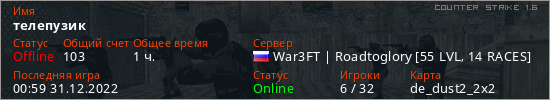 Играет на Counter Strike 1.6 сервере. Страна: РоссияПервый раз замечен 02:56 27.04.2021