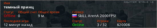 Играет на Counter Strike 1.6 сервере. Страна: РоссияПервый раз замечен 16:59 28.09.2025