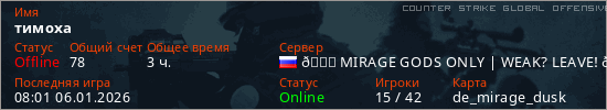 Играет на Counter Strike Global Offensive сервере. Страна: РоссияПервый раз замечен 11:21 05.12.2024