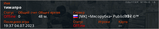 Играет на Counter Strike 1.6 сервере. Страна: РоссияПервый раз замечен 11:39 03.07.2023