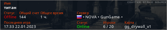Играет на Counter Strike Source сервере. Страна: РоссияПервый раз замечен 14:47 19.11.2022