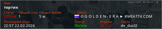 Играет на Counter Strike 1.6 сервере. Страна: РоссияПервый раз замечен 22:51 22.02.2026