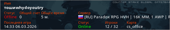 Играет на Counter Strike Global Offensive сервере. Страна: РоссияПервый раз замечен 14:31 06.03.2026