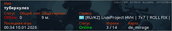 Играет на Counter Strike Global Offensive сервере. Страна: КазахстанПервый раз замечен 23:15 09.01.2026