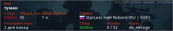 Играет на Counter Strike Global Offensive сервере. Страна: РоссияПервый раз замечен 19:48 08.02.2026