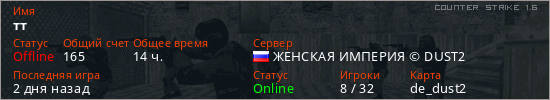 Играет на Counter Strike 1.6 сервере. Страна: РоссияПервый раз замечен 23:18 30.07.2022