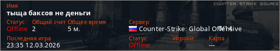 Играет на Counter Strike Source сервере. Страна: РоссияПервый раз замечен 23:06 12.03.2026