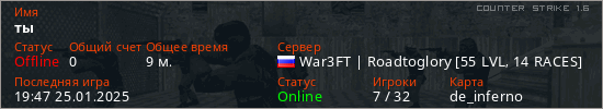 Последний раз был в сети 19:47 25.01.2025 Игрок с таким ником замечен на 21 сервере