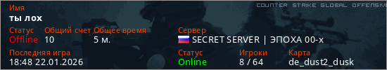 Играет на Counter Strike Global Offensive сервере. Страна: РоссияПервый раз замечен 18:11 22.01.2026