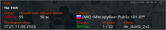 Играет на Counter Strike 1.6 сервере. Страна: РоссияПервый раз замечен 20:15 28.05.2024