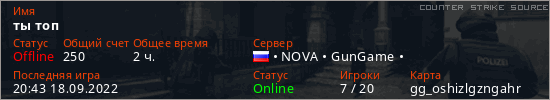 Играет на Counter Strike Source сервере. Страна: РоссияПервый раз замечен 21:00 16.09.2022