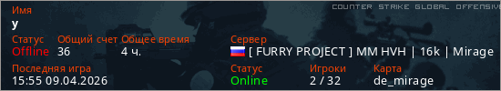 Играет на Counter Strike Global Offensive сервере. Страна: РоссияПервый раз замечен 10:58 29.03.2026