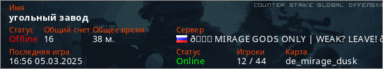 Играет на Counter Strike Global Offensive сервере. Страна: РоссияПервый раз замечен 17:01 27.02.2025