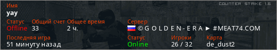 Играет на Counter Strike 1.6 сервере. Страна: РоссияПервый раз замечен 01:01 17.10.2025