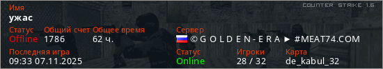 Играет на Counter Strike 1.6 сервере. Страна: РоссияПервый раз замечен 01:44 17.01.2023