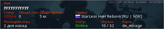 Играет на Counter Strike Global Offensive сервере. Страна: РоссияПервый раз замечен 22:24 09.03.2026