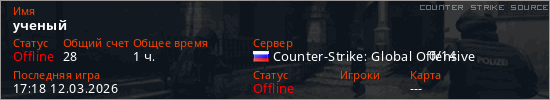 Играет на Counter Strike Source сервере. Страна: РоссияПервый раз замечен 14:33 09.03.2026