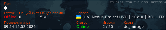 Играет на Counter Strike Global Offensive сервере. Страна: УкраинаПервый раз замечен 09:33 15.02.2026