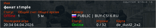 Играет на Counter Strike 1.6 сервере. Страна: РоссияПервый раз замечен 20:31 04.04.2026