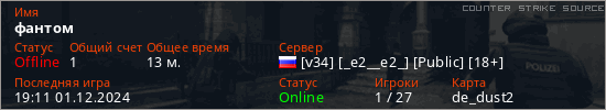 Играет на Counter Strike Source сервере. Страна: РоссияПервый раз замечен 15:38 10.10.2024