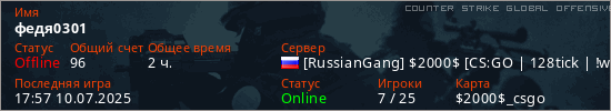 Играет на Counter Strike Global Offensive сервере. Страна: РоссияПервый раз замечен 23:30 30.06.2025
