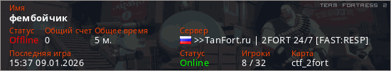 Играет на Team Fortress 2 сервере. Страна: РоссияПервый раз замечен 15:10 09.01.2026