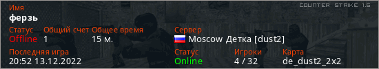 Играет на Counter Strike 1.6 сервере. Страна: РоссияПервый раз замечен 20:40 13.12.2022