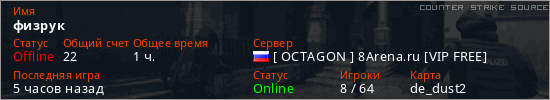 Играет на Counter Strike Source сервере. Страна: РоссияПервый раз замечен 06:21 03.03.2026