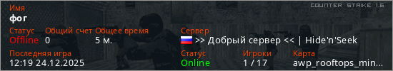 Последний раз был в сети 12:19 24.12.2025 Игрок с таким ником замечен на 17 серверах