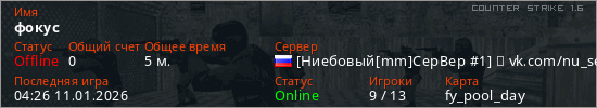 Играет на Counter Strike 1.6 сервере. Страна: РоссияПервый раз замечен 02:59 11.01.2026